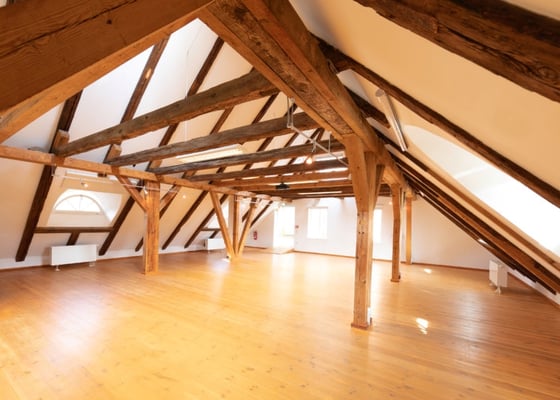 Unsere Yoga- und Pilatespraxis findet direkt in einem 200 qm großen Seminar-Raum unter dem Dach der historischen Burg mit hoher Deckenhöhe und dem Charme der alten Dachbalken statt.